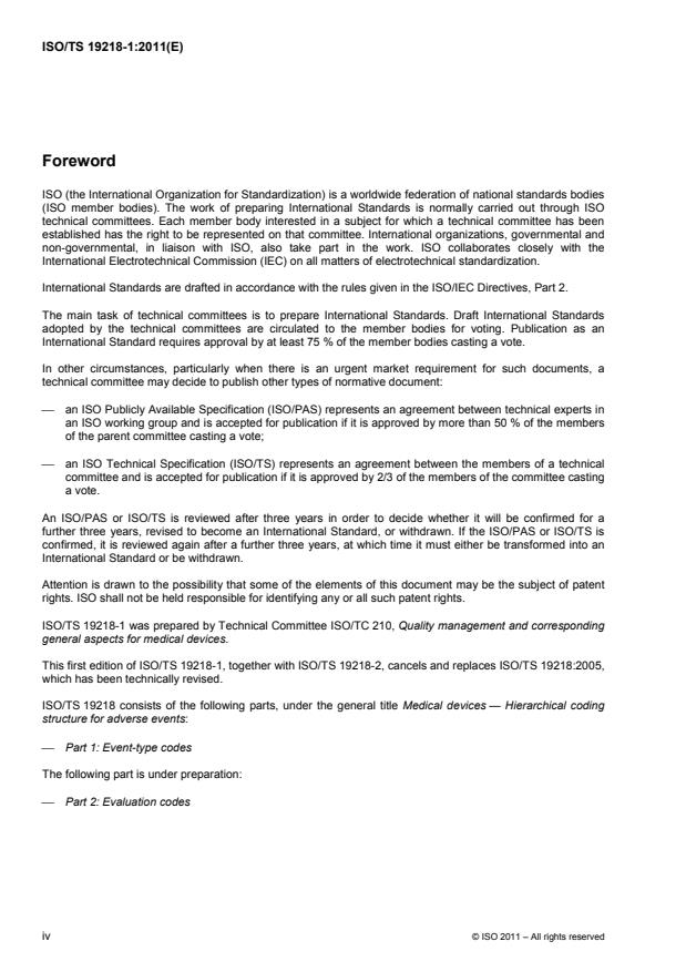 ISO/TS 19218-1:2011 is a technical specification published by the International Organization for Standardization (ISO). Its full title is "Medical devices — Hierarchical coding structure for adverse events — Part 1: Event-type codes". This standard covers: ISO/TS 19218-1:2011 specifies requirements for a hierarchical coding structure for describing adverse events relating to medical devices. The codes are intended for use by medical device users, manufacturers, regulatory authorities, health care facilities and other organizations. The codes can be used for coding events that are not related to death or serious injury, or malfunctions that could lead to death or serious injury. ISO/TS 19218-1:2011 is not intended to be used to decide whether an incident is reportable or not.