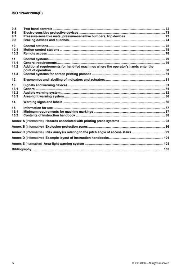 INTERNATIONAL STANDARD ISO 12648:2006(E) © ISO 2006 – All rights reserved 1Graphic technology — Safety requirements for printing press systems 1 Scope This International Standard provides safety requirements for the design and construction of machines used in printing press systems, including auxiliary equipment and finishing machines, in which all the machine actuators (e.g. drives) of the equipment in the system are controlled by the same control system. It is applicable only to systems in which a printing press is part of the system. In cases where a binding/finishing system is not integrated with a printing press, ISO 12649 [32] will apply. It addresses recognized hazards specific to printing press systems in the following areas: ⎯ mechanical; ⎯ electrical; ⎯ slipping, tripping, falling; ⎯ ergonomics; ⎯ noise; ⎯ radiation; ⎯ fire and explosion; ⎯ thermal; ⎯ emissions. Equipment covered by this International Standard may be used in a stand-alone configuration, or in combination with other machines affected by an integrated control system. These may include, but are not limited to, the combinations of the machines noted in Clause 4. This International Standard applies to machines manufactured one year or more after the date of publication of this International Standard.