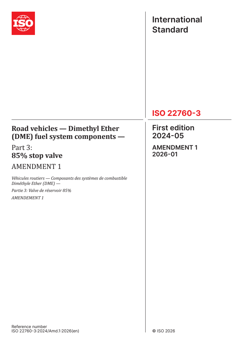 ISO 22760-3:2024/Amd 1:2026 is a standard published by the International Organization for Standardization (ISO). Its full title is "Road vehicles — Dimethyl Ether (DME) fuel system components — Part 3: 85% stop valve — Amendment 1". This standard covers: Road vehicles — Dimethyl Ether (DME) fuel system components — Part 3: 85% stop valve — Amendment 1