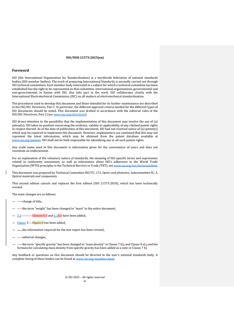 — — the term “specific gravity” has been changed to “mass density” in Clause 7 b)) and Clause 8 a).) and the