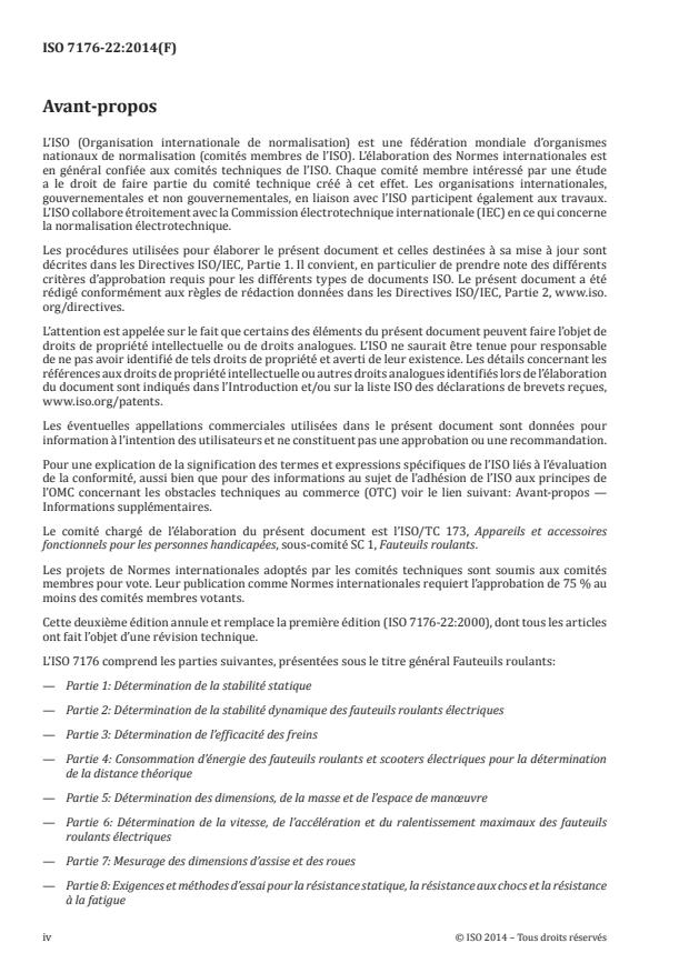 L'ISO 7176-22:2014 spécifie une procédure de réglage à utiliser dans le cadre de la préparation des fauteuils roulants réglables, lorsqu'ils sont soumis à des essais. Cette procédure tient compte des instructions du fabricant. L'ISO 7176-22:2014 est applicable aux fauteuils roulants manuels et électriques (y compris les scooters) destinés à permettre un déplacement en intérieur et/ou en extérieur.
