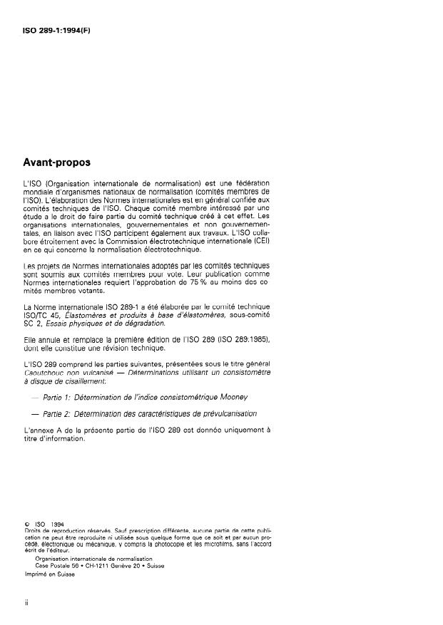 ISO 289-1:1994 - Caoutchouc non vulcanisé -- Déterminations utilisant un consistometre a disque de cisaillement