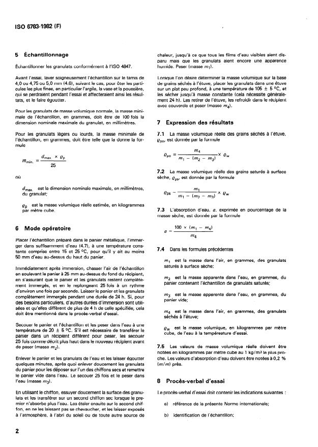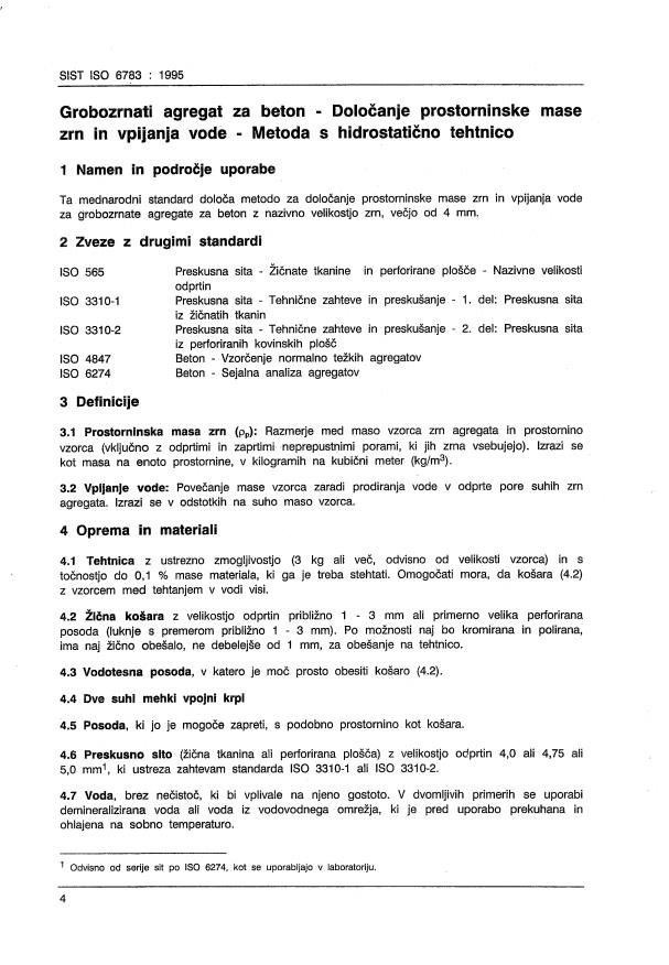 ISO 6783:1982 is a standard published by the International Organization for Standardization (ISO). Its full title is "Coarse aggregates for concrete — Determination of particle density and water absorption — Hydrostatic balance method". This standard covers: Specifies a method for the determination of the particle density and water absorption of coarse aggregates, having a nominal size greater than 4 mm, for concrete. Covers definitions, apparatus and materials, sampling, procedure, expression of results, and test report.