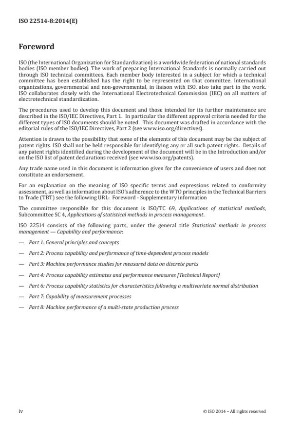 ISO 22514-8:2014 is a standard published by the International Organization for Standardization (ISO). Its full title is "Statistical methods in process management - Capability and performance - Part 8: Machine performance of a multi-state production process". This standard covers: ISO 22514-8:2014 aims to define the evaluation method to quantify the short-term capability of a production process (capacity of the production tool, widely termed capability), i.e. the machine performance index, to ensure compliance to a toleranced measurable product characteristic, when said process does not feature any kind of sorting system. If the production process integrates a sorting system, then this one (clearing away nonconforming parts) should be analysed independently. ISO 22514-8:2014 does not aim to define evaluation methods of the capability of a production process that is gauged through long-term observation (capability process or performance process indices). ISO 22514-8:2014 defines the principles guiding the development of indicators for quantifying capability, and the statistical methods to be employed. The characteristics used to evaluate production process capability have statistical distributions, and it is presumed, a priori, that at least one of these distributions is multi-modal. A distribution is presumed to be multimodal if it results from the marked effect of at least one cause inducing a significant difference between the produced items. ISO 22514-8:2014 applies, for example, to characteristics generated by processes such as the following: multi-cavity casting, multi-fixture machining, batch load treatments. Each cavity, fixture, or position in the batch load corresponds to a different state. The multi-state process can be understood as the result of the combination of different states within the same process (e.g. cavity, fixture, position in the batch load).