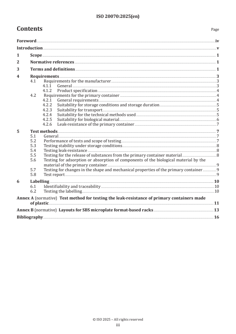 ISO 20070:2025 is a standard published by the International Organization for Standardization (ISO). Its full title is "Biotechnology - Biobanking - Requirements for primary containers for storing biological materials in biobanks". This standard covers: This document specifies requirements for primary containers intended for the storage of biological materials in biobanks. In addition to general requirements, this document also specifies special requirements depending on the storage conditions, the biological material and the intended use, as well as requirements for documentation and quality control. These requirements establish the framework for ensuring that primary containers meet the necessary quality criteria. This document specifies test criteria and test methods that enable proof of conformity with the requirements. This document is primarily aimed at manufacturers that produce primary containers for the storage of biological materials. Biobanks, submitters and users of biological material, and organizations that monitor or control the work of biobanks can also use this document. NOTE For primary containers intended for biological material for therapeutic use, other requirements can apply.