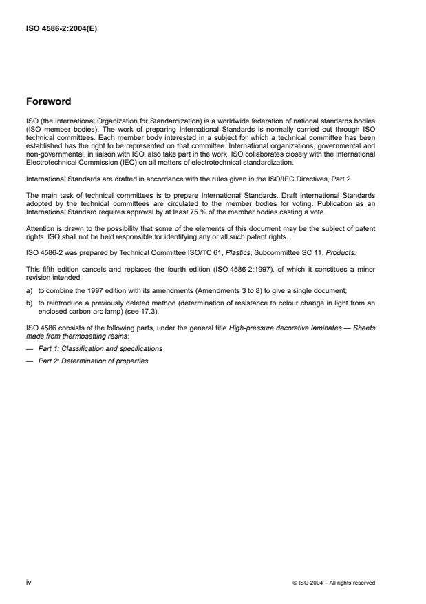 ISO 4586-2:2004 is a standard published by the International Organization for Standardization (ISO). Its full title is "High-pressure decorative laminates — Sheets made from thermosetting resins — Part 2: Determination of properties". This standard covers: ISO 4586-2:2004 specifies methods of test for determination of the properties of high-pressure decorative laminated sheets.