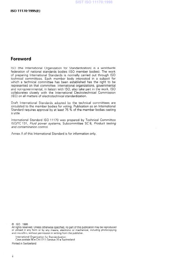 ISO 11170:1995 is a standard published by the International Organization for Standardization (ISO). Its full title is "Hydraulic fluid power — Filter elements — Procedure for verifying performance characteristics". This standard covers: Defines a procedure for verification of the performance characteristics of filter elements. It can be used to check their hydraulic, mechanical and separation characteristics.