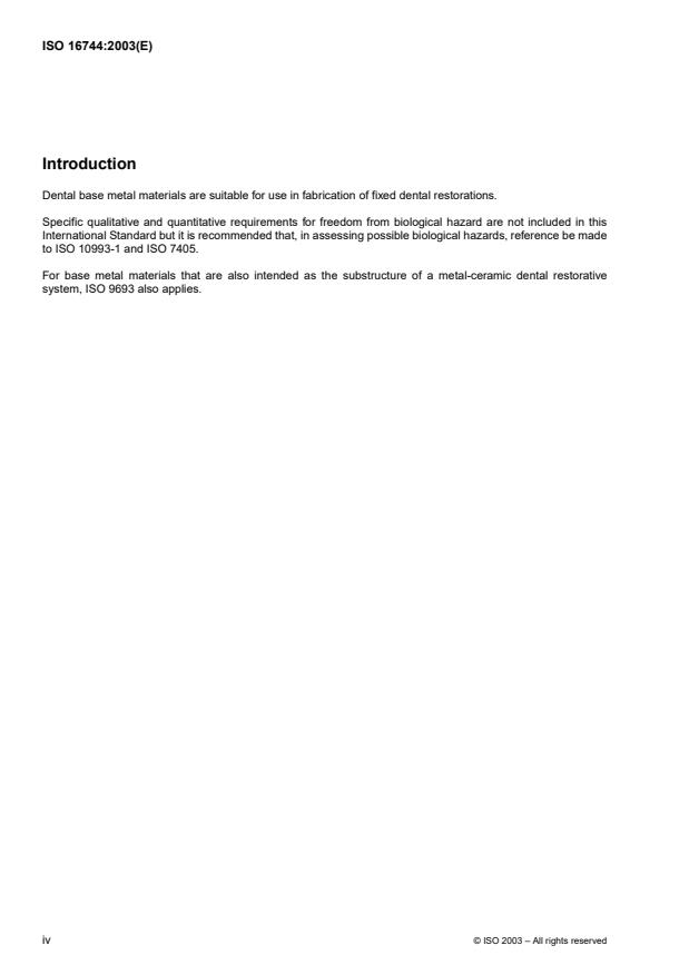 ISO 16744:2003 gives the classification of, and specifies requirements and test methods for metallic materials with a base metal as the main constituent. It applies to base metal materials suitable for use in fabrication of fixed dental restorations. ISO 16744:2003 is not applicable to base metal materials intended for use in the fabrication of removable appliances, for which ISO 6871-2 and ISO 6871-2 apply.