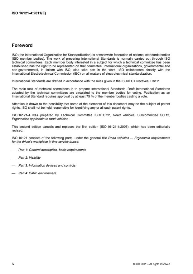 ISO 16121-4:2011 is a standard published by the International Organization for Standardization (ISO). Its full title is "Road vehicles — Ergonomic requirements for the driver's workplace in line-service buses — Part 4: Cabin environment". This standard covers: ISO 16121-4:2011 specifies minimum requirements for the cabin environment. ISO 16121-4:2011 applies to the driver's workplace in low-floor line-service buses designed for the carriage of passengers, comprising more than eight seats in addition to the driver's seat, and having a maximum weight exceeding five metric tonnes and an overall width exceeding 2,30 m.