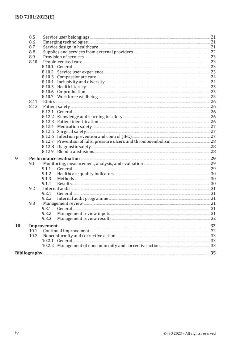 ISO 7101:2023 is a standard published by the International Organization for Standardization (ISO). Its full title is "Healthcare organization management - Management systems for quality in healthcare organizations - Requirements". This standard covers: The purpose of this document is to provide organizations with requirements to deliver high-quality healthcare and specifies requirements for management systems for quality in healthcare organizations when an organization desires to: a) demonstrate its ability to consistently meet service user, stakeholder, and applicable statutory and regulatory requirements; b) enhance service user experience during the continuum of care and continually improve healthcare quality; and c) create and maintain processes that ensure timely, safe, effective, efficient, equitable, and people-centred care. The requirements of this document are based on recognized best practices and are intended to be applicable to any organization providing healthcare services, regardless of its type, size, or the services it provides.