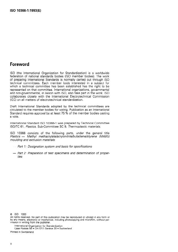 ISO 10366-1:1993 is a standard published by the International Organization for Standardization (ISO). Its full title is "Plastics — Methyl methacrylate/acrylonitrile/butadiene/styrene (MABS) moulding and extrusion materials — Part 1: Designation system and basis for specifications". This standard covers: The types of MABS plastics are differentiated from each other by a classification system based on appropriate levels of the designatory properties Vicat softening temperature, melt flow rate, impact strength, flexural modulus and on information about basic polymer parameters, intended application and/or method of processing, important properties, additives, colorants, fillers and reinforcing materials. Is applicable to materials ready for normal use in the form of powder, granules or pellets and to materials unmodified or modified by colorants, additives, fillers, etc.