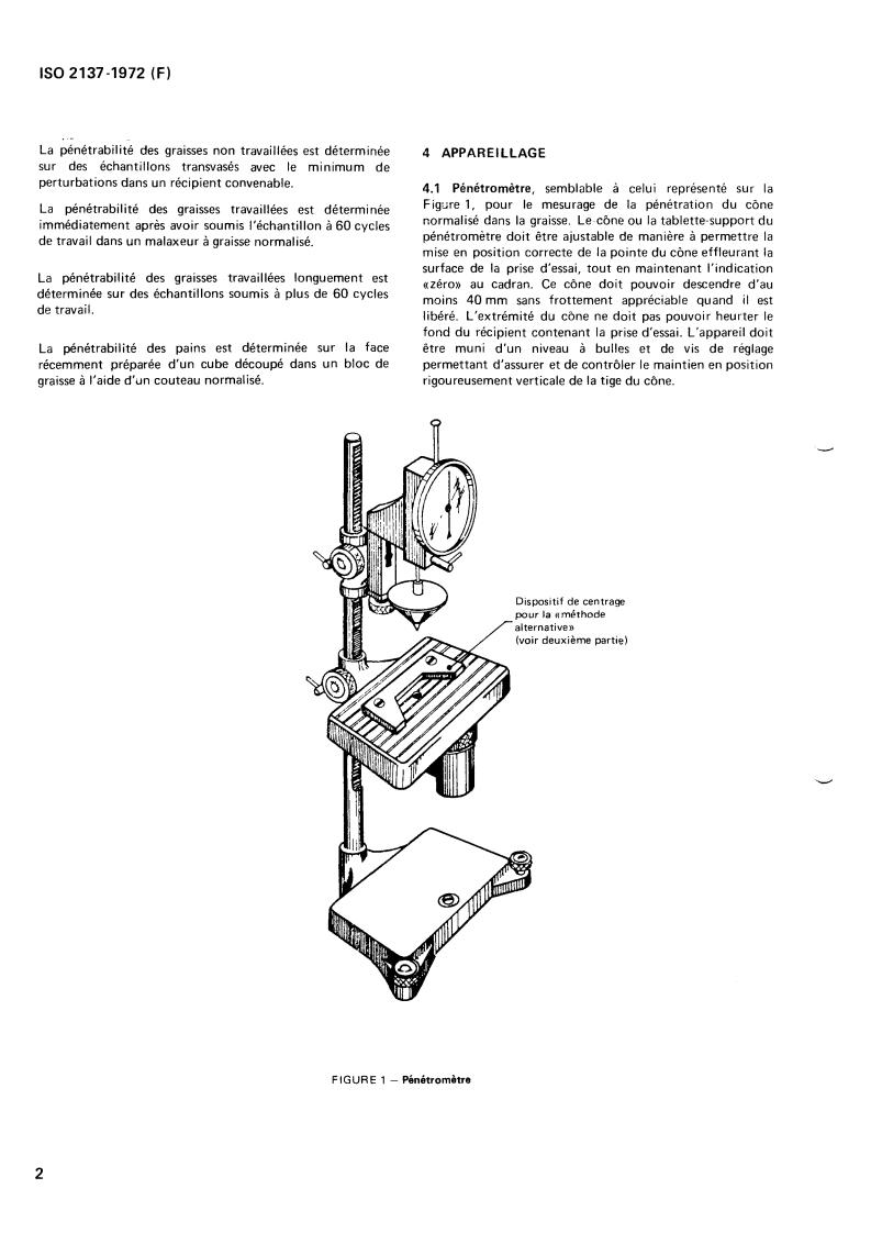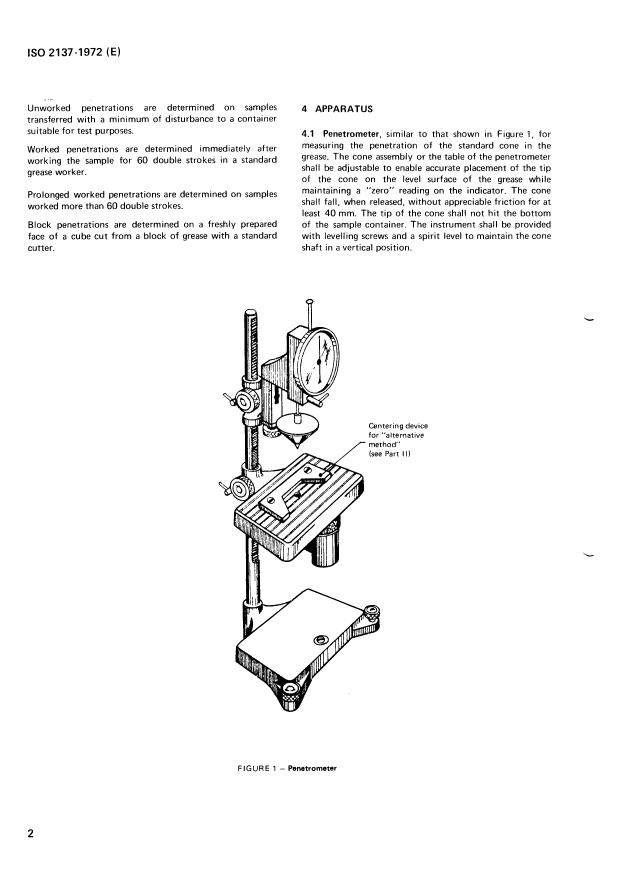 ISO 2137:1972 is a standard published by the International Organization for Standardization (ISO). Its full title is "Petroleum products — Lubricating grease — Determination of cone penetration". This standard covers: Petroleum products — Lubricating grease — Determination of cone penetration