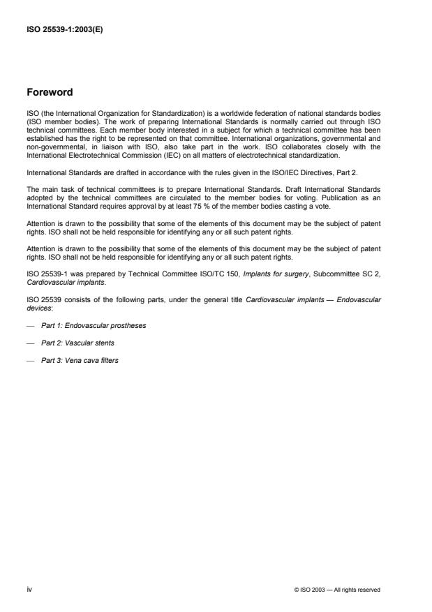 ISO 25539-1:2003 specifies requirements for endovascular prostheses, based upon current medical knowledge. With regard to safety, it gives requirements for intended performance, design attributes, materials, design evaluation, manufacturing, sterilization packaging and information supplied by the manufacturer. It should be considered as a supplement to ISO 14630, which specifies general requirements for the performance of non-active surgical implants. ISO 25539-1:2003 is applicable to endovascular prostheses used to treat arterial aneurysms, arterial stenoses, or other appropriate vascular abnormalities. ISO 25539-1:2003 is applicable to delivery systems if they comprise an integral component of the deployment of the endovascular prostheses. ISO 25539-1:2003 is not applicable to vascular occluders, with the exception of contra-lateral iliac occluders when used as an integral part of an aorto-uni-iliac device. See ISO 14630 for excluded products. ISO 25539-1:2003 is not applicable to procedures and devices used prior to the introduction of the endovascular system, such as balloon angioplasty devices.