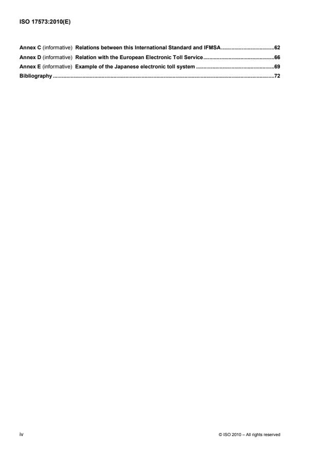ISO 17573:2010 is a standard published by the International Organization for Standardization (ISO). Its full title is "Electronic fee collection - Systems architecture for vehicle-related tolling". This standard covers: ISO 17573:2010 defines the architecture of a toll system environment in which a customer with one contract can use a vehicle in a variety of toll domains and with a different Toll Charger for each domain. Toll systems covered by ISO 17573:2010 can be used for various purposes including road (network) tolling, area tolling, collecting toll for bridges, tunnels, ferries, for access, and for parking. From a technical point of view the considered toll systems use electronic equipment on board a vehicle. From a process point of view the architectural description focuses on toll determination, toll charging, and the associated enforcement measures. The actual collection of the toll, i.e. collecting payments, is not included. The architecture in ISO 17573:2010 is defined with no more details than those required for an overall overview, a common language, an identification of the need for other standards, and the drafting of these standards.