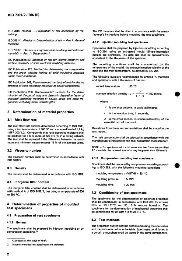 ISO 7391-2:1986 - Plastics — Polycarbonate moulding and extrusion materials — Part 2: Preparation of test specimens and determination of properties Released:3/20/1986