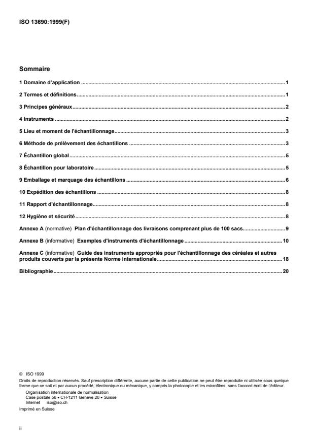 ISO 13690:1999 is a standard published by the International Organization for Standardization (ISO). Its full title is "Cereals, pulses and milled products — Sampling of static batches". This standard covers: La présente Norme internationale est applicable à l'échantillonnage manuel ou mécanique des grains statiques en vrac jusqu'à une profondeur de 3 m. Pour les produits statiques en vrac dont la profondeur est comprise entre 3 m et 12 m au maximum, il est nécessaire d'utiliser des méthodes d'échantillonnage mécanique. Les lots de grains en vrac dont la profondeur dépasse 12 m doivent être échantillonnés en mouvement. Cette dernière méthode peut néanmoins être applicable quelle que soit la profondeur de grain (voir l'ISO 6644).La présente Norme internationale n'est pas applicable aux semences ni à l'échantillonnage des grains destinés aux essais de détection de l'infestation cachée par les insectes. Elle n'est pas applicable non plus aux grains en mouvement.La présente Norme internationale n'est pas applicable à certains types d'échantillonnage (par exemple dans le cas d'un échantillonnage réalisé en vue d'un examen bactériologique, ou de la recherche de mycotoxines ou de résidus de pesticides). Dans ces cas, il est souhaitable que les parties concernées trouvent un accord préalable sur les modalités d'échantillonnage.NOTE 1 L'échantillonnage des semences est régi par les règles établies par PISTA (International Seed Testing Association).NOTE 2 L'échantillonnage des grains destinés à la détermination de l'infestation cachée par les insectes est traité dans l'ISO 6639-2.NOTE 3 L'ISO 6644 traite de l'échantillonnage des grains en mouvement.