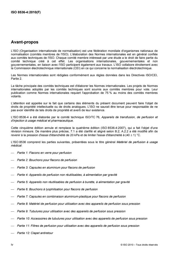 L'ISO 8536-4:2010 spécifie les exigences applicables aux appareils de perfusion à usage médical, non réutilisables, à alimentation par gravité, afin d'assurer leur compatibilité avec les récipients contenant des solutions de perfusion et avec les appareils intraveineux. Le deuxième objectif de l'ISO 8536-4:2010 est de donner des directives sur les spécifications relatives à la qualité et aux performances des matériaux utilisés dans les appareils de perfusion et de proposer une terminologie concernant les composants de ces derniers. Dans certains pays, la pharmacopée nationale ou d'autres règlements nationaux ont force d'obligation et ont priorité sur l'ISO 8536-4:2010.