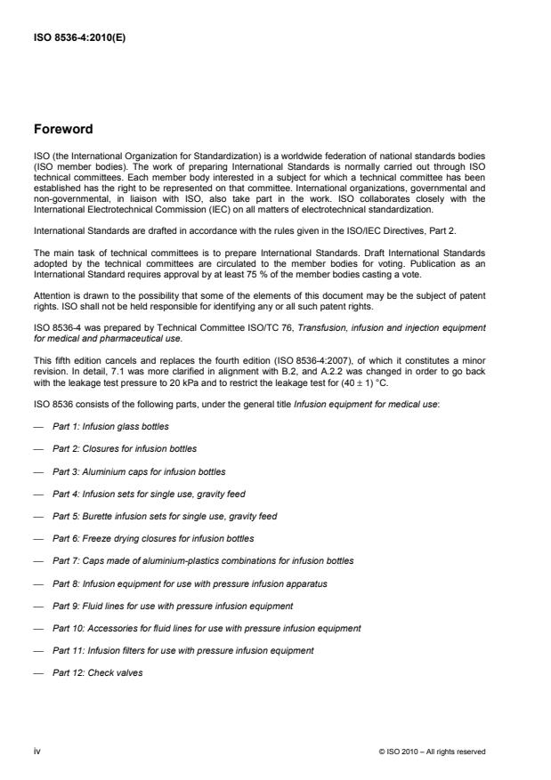 ISO 8536‑4:2010 specifies requirements for single use, gravity feed infusion sets for medical use in order to ensure their compatibility with containers for infusion solutions and intravenous equipment. Secondary aims of ISO 8536‑4:2010 are to provide guidance on specifications relating to the quality and performance of materials used in infusion sets and to present designations for infusion set components. In some countries, the national pharmacopoeia or other national regulations are legally binding and take precedence over ISO 8536‑4:2010.