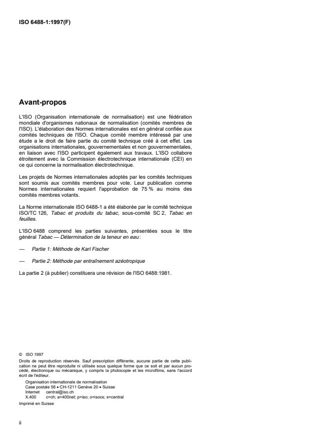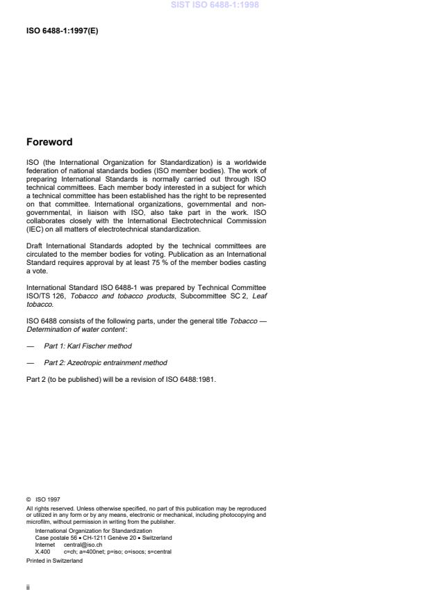 ISO 6488-1:1997 is a standard published by the International Organization for Standardization (ISO). Its full title is "Tobacco — Determination of water content — Part 1: Karl Fischer method". This standard covers: Tobacco — Determination of water content — Part 1: Karl Fischer method