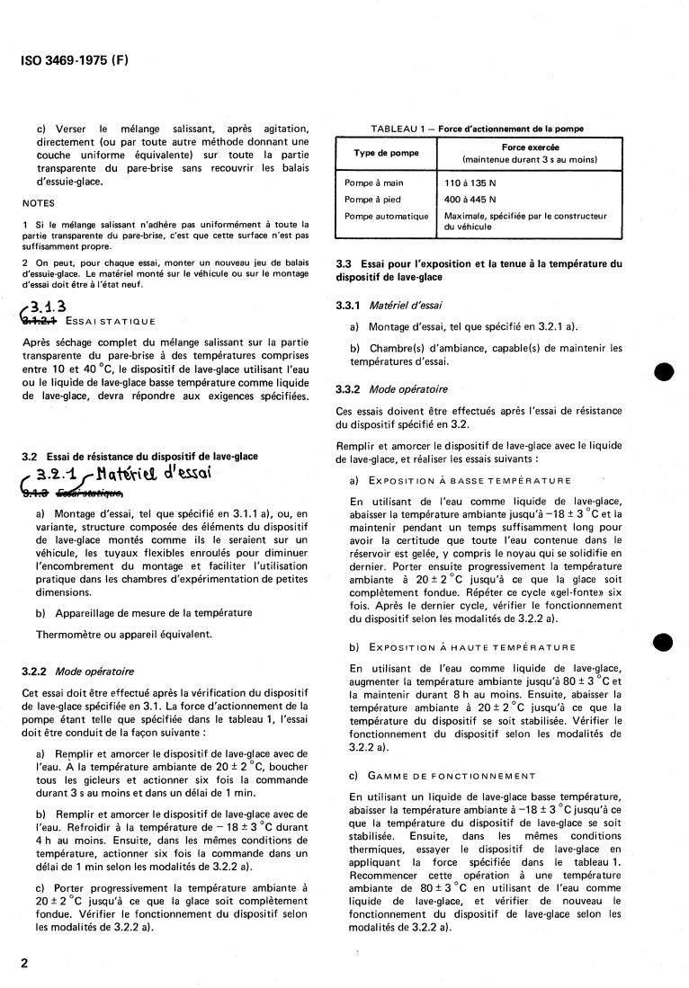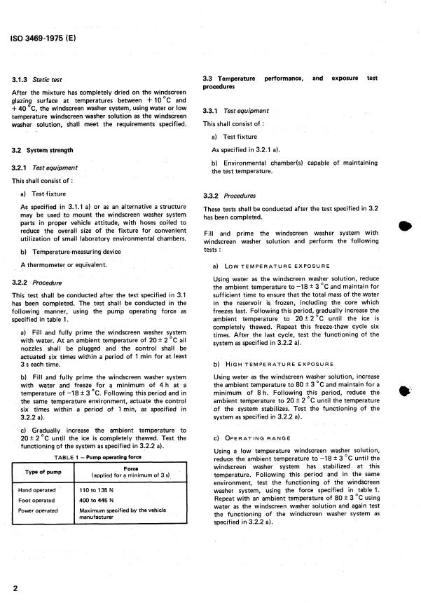 ISO 3469:1975 is a standard published by the International Organization for Standardization (ISO). Its full title is "Road vehicles — Windscreen washer systems for passenger cars — Test methods". This standard covers: Road vehicles — Windscreen washer systems for passenger cars — Test methods