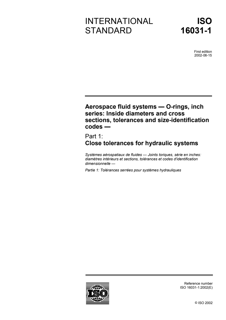 ISO 16031-1:2002 - Aerospace fluid systems — O-rings, inch series: Inside diameters and cross sections, tolerances and size-identification codes — Part 1: Close tolerances for hydraulic systems Released:6/20/2002