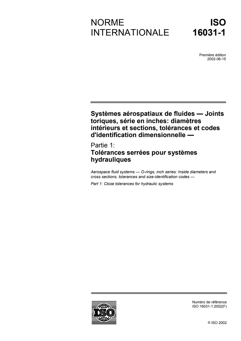 L'ISO 16031-1 spécifie les diamètres intérieurs, les diamètres de section, les tolérances et les codes d'identification dimensionnelle des joints toriques, série en inches, destinés aux systèmes aérospatiaux de fluides. Elle s'applique aux matériaux nitrile et éthylène propylène destinés à être utilisés dans des systèmes hydrauliques à haute pression à condition qu'un outillage adapté soit utilisé.