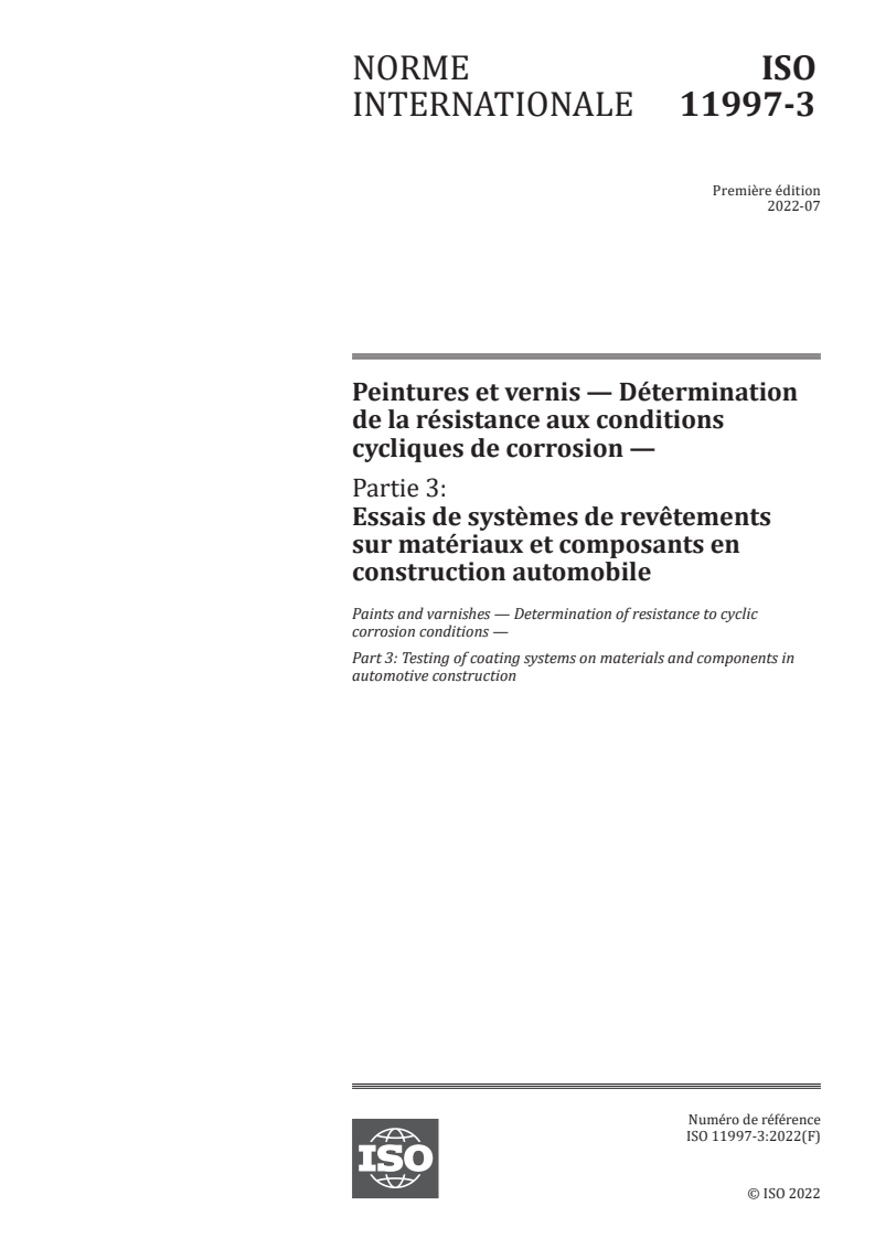 ISO 11997-3:2022 - Peintures et vernis — Détermination de la résistance aux conditions cycliques de corrosion — Partie 3: Essais de systèmes de revêtements sur matériaux et composants en construction automobile Released:10/31/2023