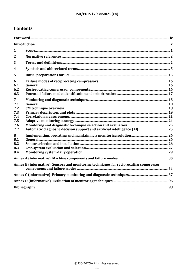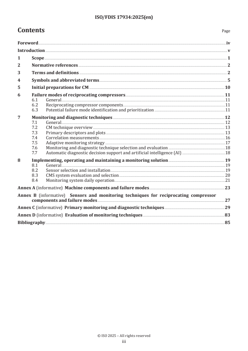ISO/FDIS 17934 references and complements existing standards (for example API STD 618 and ISO 13631) that address design, procurement and protection of reciprocating compressors. Use ISO/FDIS 17934 alongside mechanical, vibration and AMS/CMS standards to form a comprehensive condition monitoring strategy.