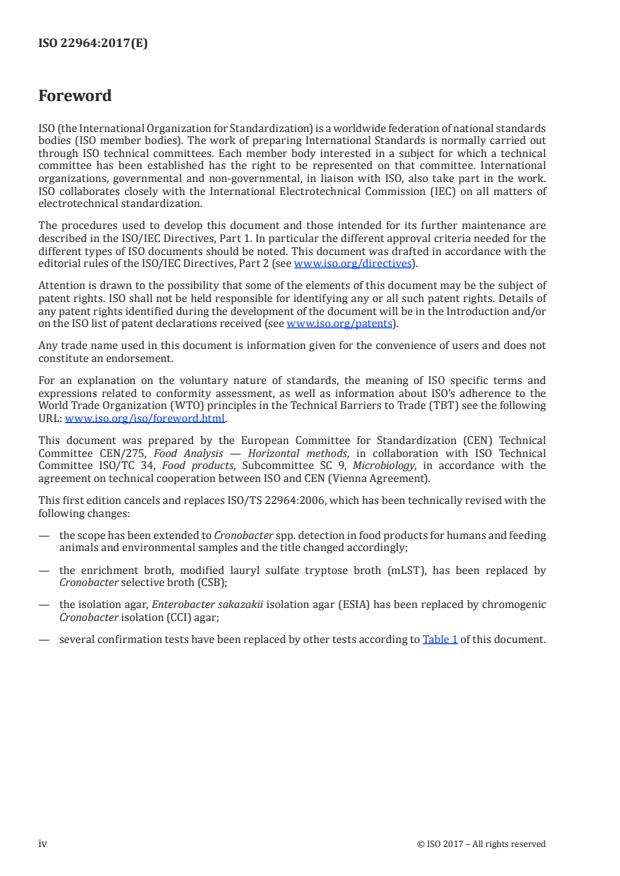 ISO 22964:2017 is a standard published by the International Organization for Standardization (ISO). Its full title is "Microbiology of the food chain — Horizontal method for the detection of Cronobacter spp.". This standard covers: ISO 22964:2017 specifies a horizontal method for the detection of Cronobacter spp. Subject to the limitations discussed in the introduction, this document is applicable to - food products and ingredients intended for human consumption and the feeding of animals, and - environmental samples in the area of food production and food handling.