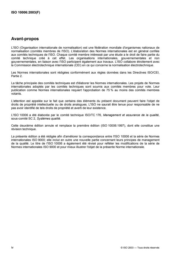 L'ISO 10006:2003 donne des conseils sur l'application du management de la qualité aux projets. Elle est applicable à des projets de complexité variable, qu'ils soient petits ou grands, de courte ou longue durée, qui se situent dans des environnements différents, quel que soit le type de produit ou de processus de projet. Il peut être nécessaire d'adapter ces conseils à un projet précis. L'ISO 10006:2003 ne constitue pas un guide pour le «management de projet» en lui-même, mais se contente de donner des conseils sur la qualité dans le cadre des processus de management de projet alors que l'ISO 9004 donne des conseils sur la qualité dans le cadre des processus relatifs au produit du projet et sur l'«approche processus». Il convient de noter que la présente Norme internationale est un recueil de conseils et qu'elle n'est pas destinée à être utilisée pour des besoins de certification/enregistrement.
