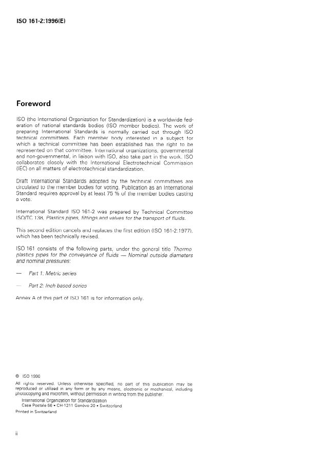 ISO 161-2:1996 is a standard published by the International Organization for Standardization (ISO). Its full title is "Thermoplastics pipes for the conveyance of fluids — Nominal outside diameters and nominal pressures — Part 2: Inch-based series". This standard covers: Specifies the nominal outside diameters for inch-based thermoplastics pipes for the conveyance of fluids under pressure and non-pressure. It also specifies nominal pressure ratings and minimum required strengths for pipes for pressure applications.