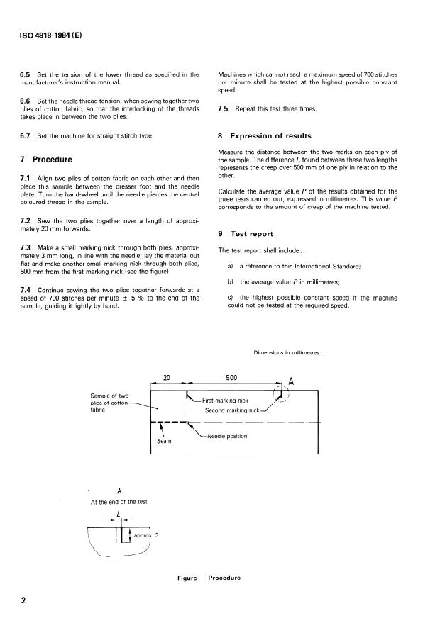 ISO 4818:1984 is a standard published by the International Organization for Standardization (ISO). Its full title is "Household sewing machines — Determination of creep of one ply of material over another". This standard covers: The method is applicable to motor-operated household sewing machines, but it may also be possible to apply it to hand- or treadle-operated machines. Includes additionally to definition, principle, preparation of the sewing machine, procedure, expression of results and test report an annex which specifies material and apparatus.