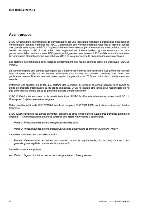 L'ISO 12966-2:2011 spécifie des méthodes de préparation des esters méthyliques d'acides gras. Elle comprend des méthodes de préparation des esters méthyliques d'acides gras à partir de corps gras d'origines animale et végétale, d'acides gras et de savons. Afin de répondre à différentes exigences, quatre méthodes de méthylation sont spécifiées, à savoir: a) une méthode de transméthylation «rapide» en conditions alcalines; b) une méthode de transméthylation/méthylation «générale» en conditions alcalines et acides séquentielles; c) une méthode de transméthylation au BF3; d) une méthode alternative reposant sur la transméthylation par catalyse acide de glycérides. Les esters méthyliques ainsi obtenus sont utilisés dans diverses méthodes d'analyse exigeant des produits dérivés de ce type, par exemple la chromatographie en phase gazeuse, la chromatographie sur couche mince et la spectrométrie infrarouge.