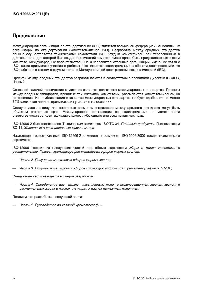 ISO 12966-2:2011 is a standard published by the International Organization for Standardization (ISO). Its full title is "Animal and vegetable fats and oils — Gas chromatography of fatty acid methyl esters — Part 2: Preparation of methyl esters of fatty acids". This standard covers: ISO 12966-2:2011 specifies methods of preparing the methyl esters of fatty acids. It includes methods for preparing fatty acid methyl esters from animal and vegetable fats and oils, fatty acids and soaps. To cover different requirements four methylation methods are specified, namely: a) a "rapid" transmethylation procedure under alkaline conditions; b) a "general" transmethylation/methylation procedure under sequential alkaline and acid conditions; c) a BF3 transmethylation procedure; d) an alternative procedure using acid-catalysed transmethylation of glycerides. Methyl esters so produced are used in various analytical procedures requiring such derivatives, e.g. gas-liquid chromatography (GC), thin-layer chromatography (TLC), and infrared spectrometry (IR).