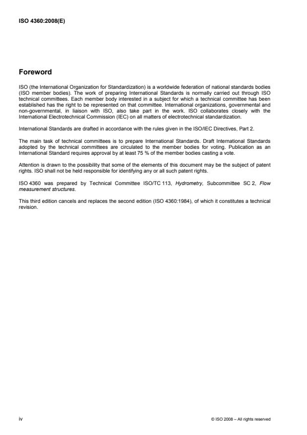 ISO 4360:2008 is a standard published by the International Organization for Standardization (ISO). Its full title is "Hydrometry — Open channel flow measurement using triangular profile weirs". This standard covers: ISO 4360:2008 specifies methods for the measurement of the flow of water in open channels under steady flow conditions using triangular profile weirs. The flow conditions considered are steady flows which are uniquely dependent on the upstream head and drowned flows which depend on downstream as well as upstream levels.