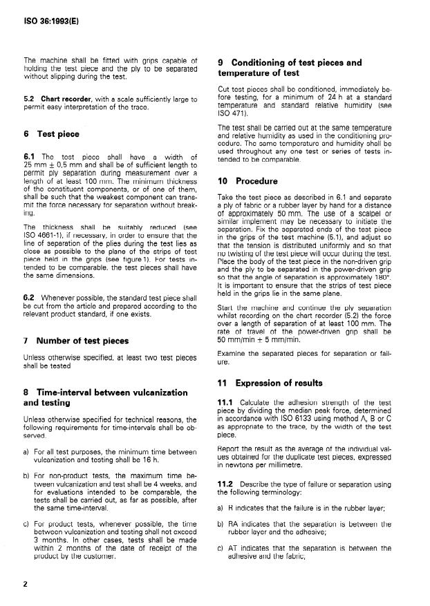 ISO 36:1993 is a standard published by the International Organization for Standardization (ISO). Its full title is "Rubber, vulcanized or thermoplastic — Determination of adhesion to textile fabric". This standard covers: Rubber, vulcanized or thermoplastic — Determination of adhesion to textile fabric