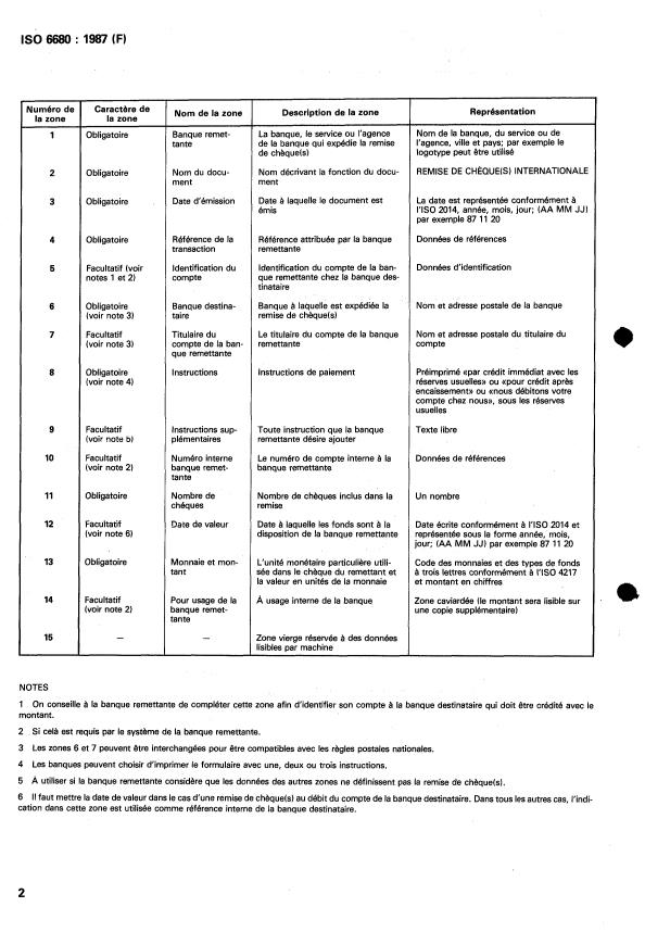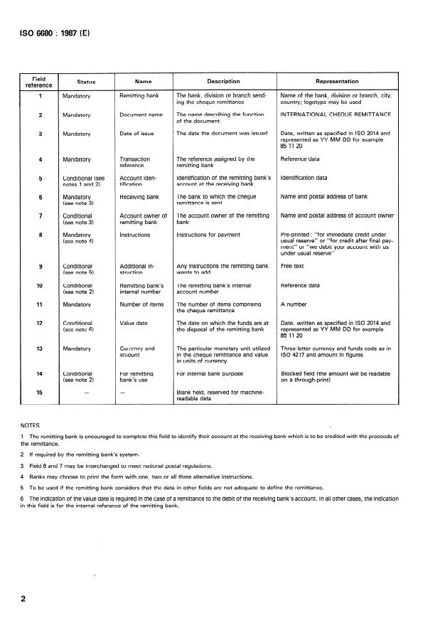 ISO 6680:1987 is a standard published by the International Organization for Standardization (ISO). Its full title is "International cheque remittance". This standard covers: International cheque remittance