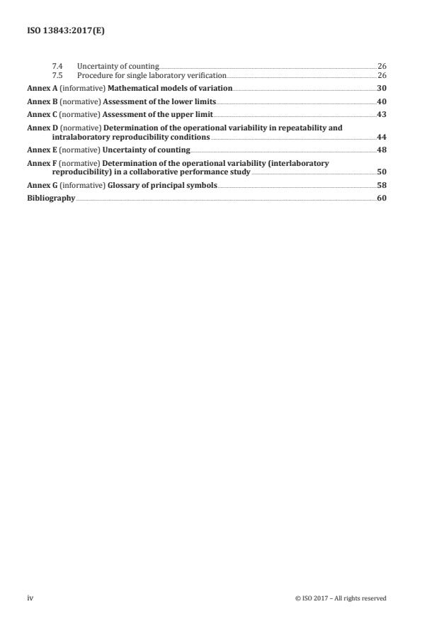 - Annexes: normative and informative annexes cover mathematical models, assessment of limits, operational variability, uncertainty of counting and collaborative study designs.
