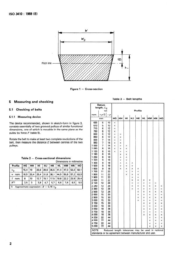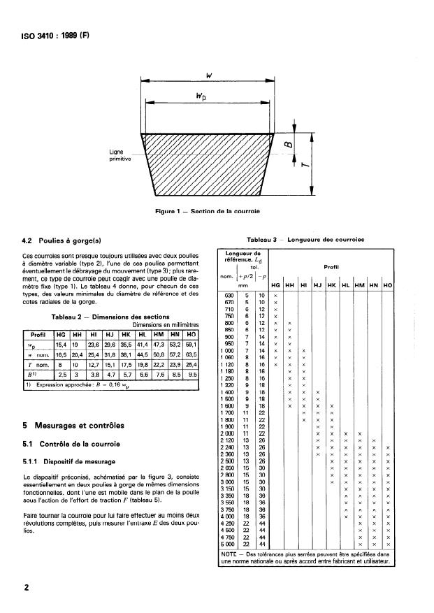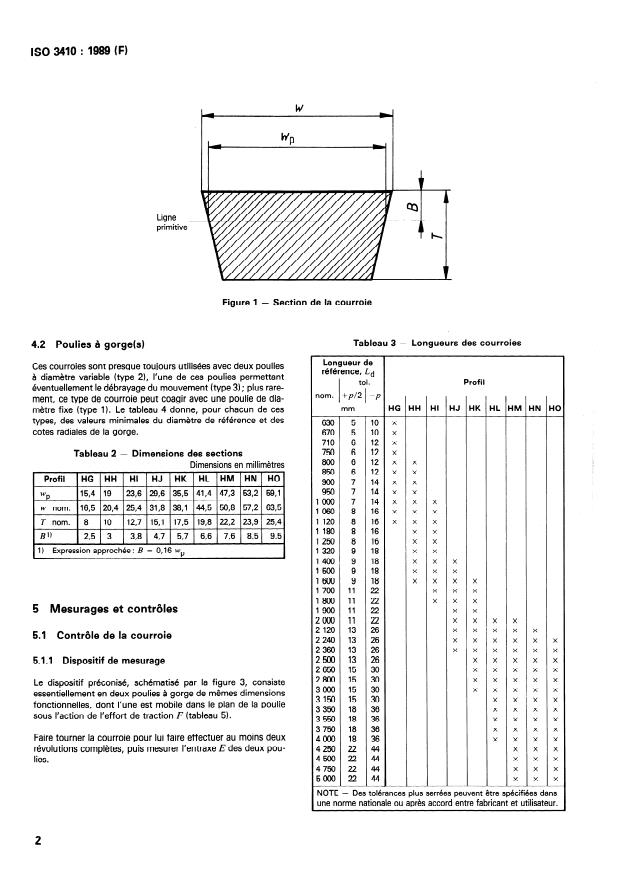 ISO 3410:1989 is a standard published by the International Organization for Standardization (ISO). Its full title is "Agricultural machinery — Endless variable-speed V-belts and groove sections of corresponding pulleys". This standard covers: This second edition cancels and replaces the first edition (1976). Specifies the main dimensions of V-belts intended for use on agricultural machinery (in particular harvester-thresher machines), together with the grove section of the corresponding fixed- or variable-diameter pulleys. Tabulates nominal values of datum length from 630 mm up to and including 5 000 mm. Some figures illustrate shapes and reference quantities of concern.