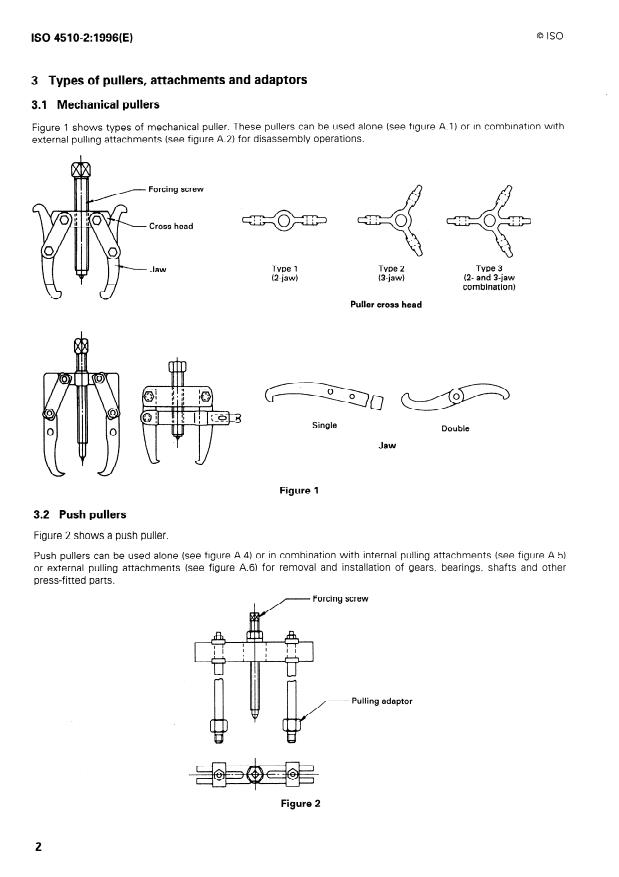 - Scope and types: Defines mechanical pullers (2‑jaw, 3‑jaw, combinations), push‑pullers, internal and external pulling attachments, pulling adaptors (male/female threads) and step‑plate adaptors. Illustrations are provided in figures 1–9.