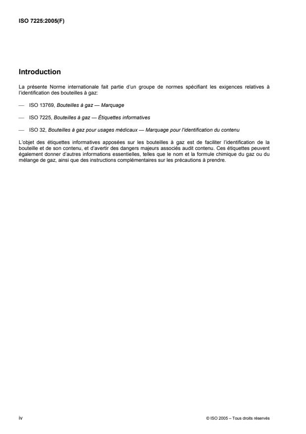 L'ISO 7225:2005 établit la conception, le contenu (c'est-à-dire les symboles de danger et le texte) et l'exploitation des étiquettes informatives destinées à être apposées sur toutes les bouteilles à gaz contenant un gaz pur ou un mélange de gaz. Les étiquettes pour bouteilles à gaz sur cadre et les étiquettes destinées à être apposées sur les cadres en question ne relèvent pas de l'ISO 7225:2005.