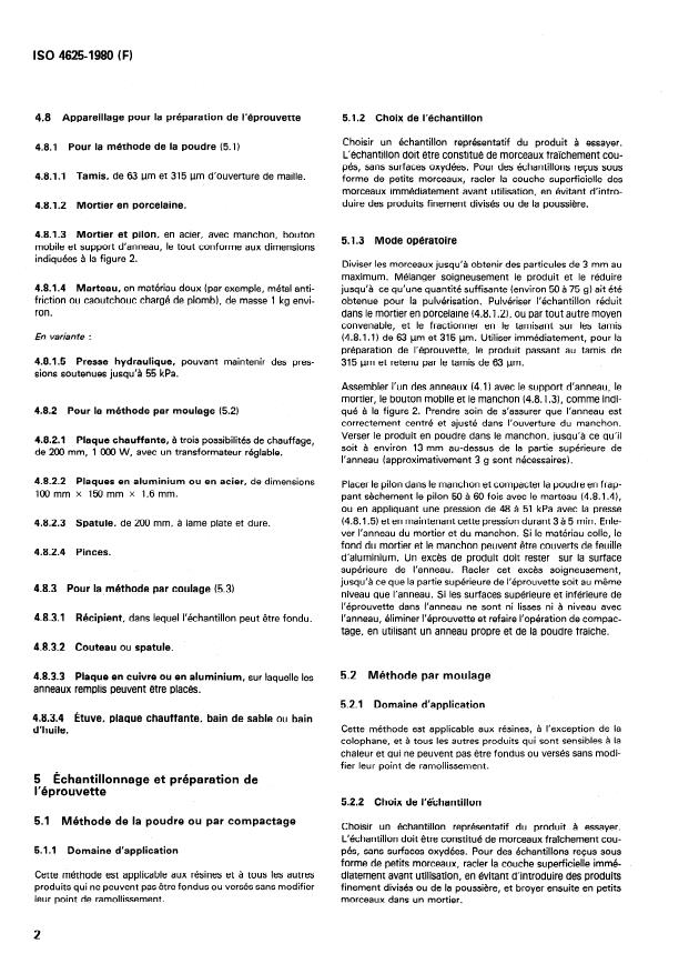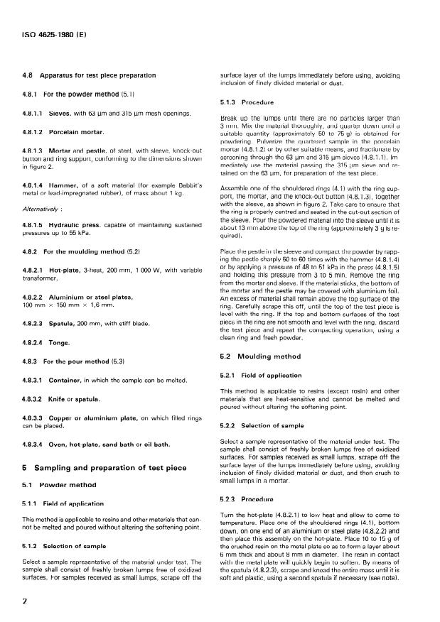 ISO 4625:1980 is a standard published by the International Organization for Standardization (ISO). Its full title is "Binders for paints and varnishes — Determination of softening point — Ring-and-ball method". This standard covers: Specifies a method of test for resins (including rosin) and similar materials by means of the ring-and-ball apparatus. In general, with materials of this type, softening does not take place at a definite temperature. As the temperature rises, these materials gradually and imperceptibly change from brittle or exceedingly thick and slow-flowing materials to softer and less viscous liquids. For this reason, the determination must be made by a fixed, arbirary, and closely defined method.