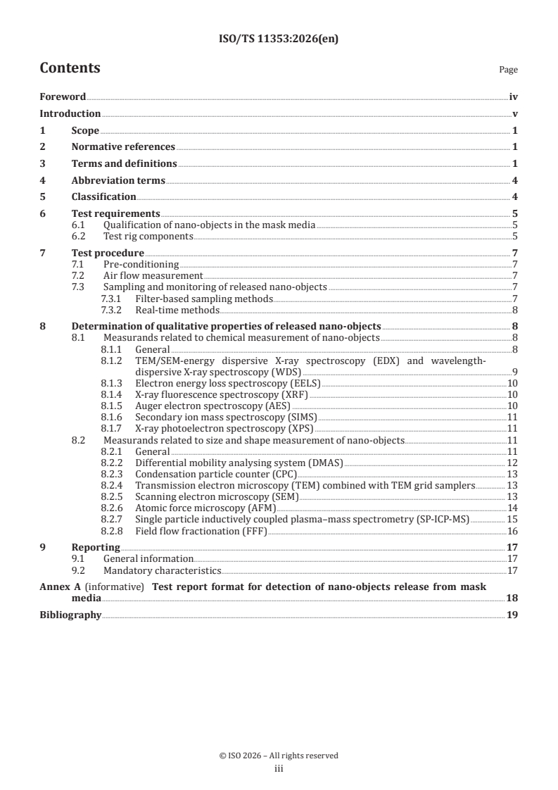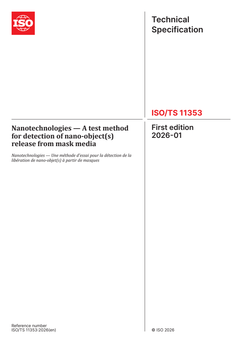 ISO/TS 11353:2026 is a technical specification published by the International Organization for Standardization (ISO). Its full title is "Nanotechnologies — A test method for detection of nano-object(s) release from mask media". This standard covers: This document specifies a test method for the detection of nano-objects release, irrespective of its causes, from surgical masks, surgical respirator masks and barrier face coverings [reusable (regardless of washing characteristics) and disposable types] containing nano-objects, irrespective of the type of production technology. In addition, this document also provides the sampling procedures and qualitative characterization methods for released nano-objects. This document can be used to show the possible exposure due to release, which relates to human health and safety.