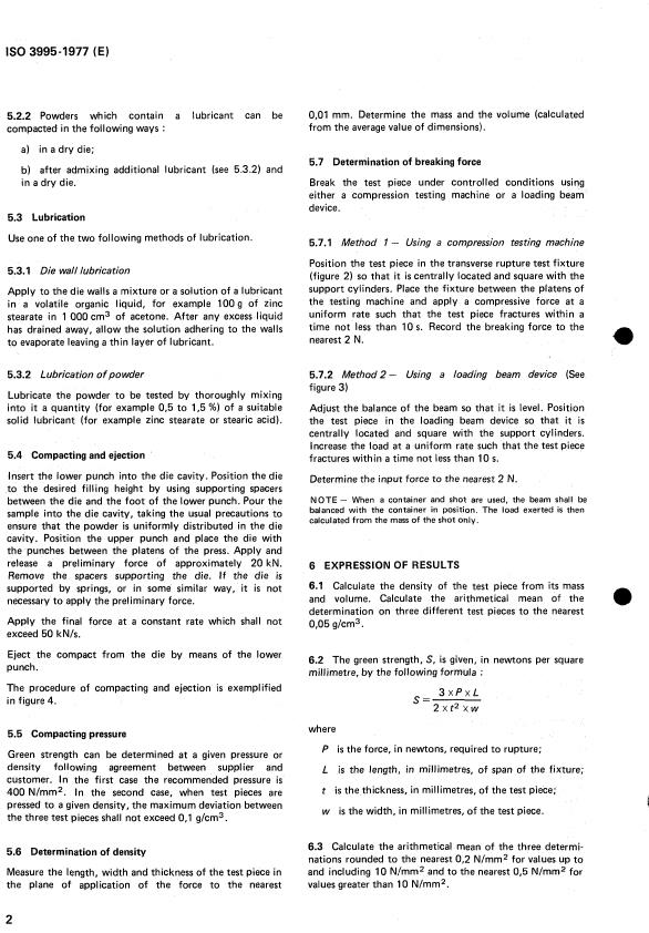 ISO 3995:1977 is a standard published by the International Organization for Standardization (ISO). Its full title is "Metallic powders — Determination of green strength by transverse rupture of rectangular compacts". This standard covers: Metallic powders — Determination of green strength by transverse rupture of rectangular compacts