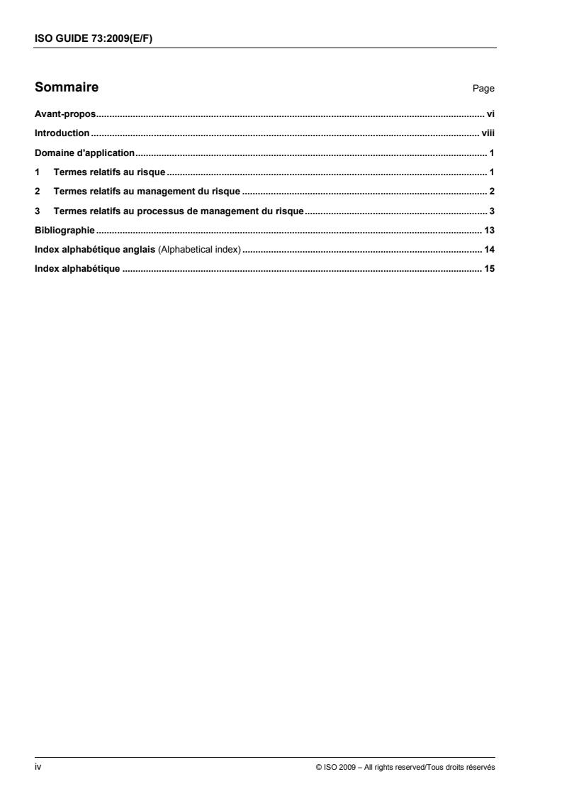 L'ISO Guide 73:2009 fournit les définitions de termes génériques relatifs au management du risque. Son but est d'encourager une compréhension commune homogène et une approche cohérente de la description des activités relatives au management du risque, ainsi qu'une utilisation uniforme de la terminologie du management du risque dans les processus et cadres organisationnels en rapport avec ce domaine. L'ISO Guide 73:2009 est à l'usage des personnes chargées du management des risques, des personnes impliquées dans les activités de l'ISO et de la CEI, et des personnes chargées de rédiger des normes, guides, procédures et codes de bonne pratique relatifs au management du risque, soit spécifiques d'un secteur, soit à l'échelle nationale. Concernant les principes et lignes directrices du management du risque, il est fait référence à l'ISO 31000:2009.