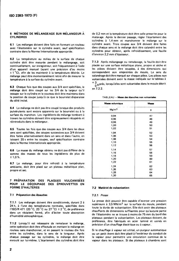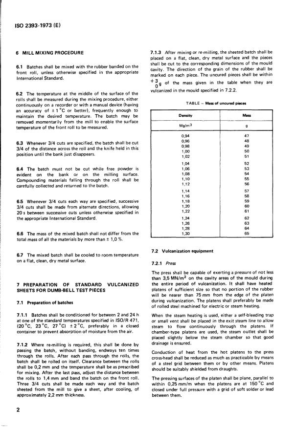 ISO 2393:1973 is a standard published by the International Organization for Standardization (ISO). Its full title is "Rubber test mixes — Preparation, mixing and vulcanization — Equipment and procedures". This standard covers: Rubber test mixes — Preparation, mixing and vulcanization — Equipment and procedures