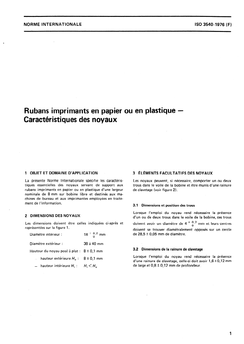 ISO 3540:1976 - Rubans imprimants en papier ou en plastique — Caractéristiques des noyaux/1/1976
