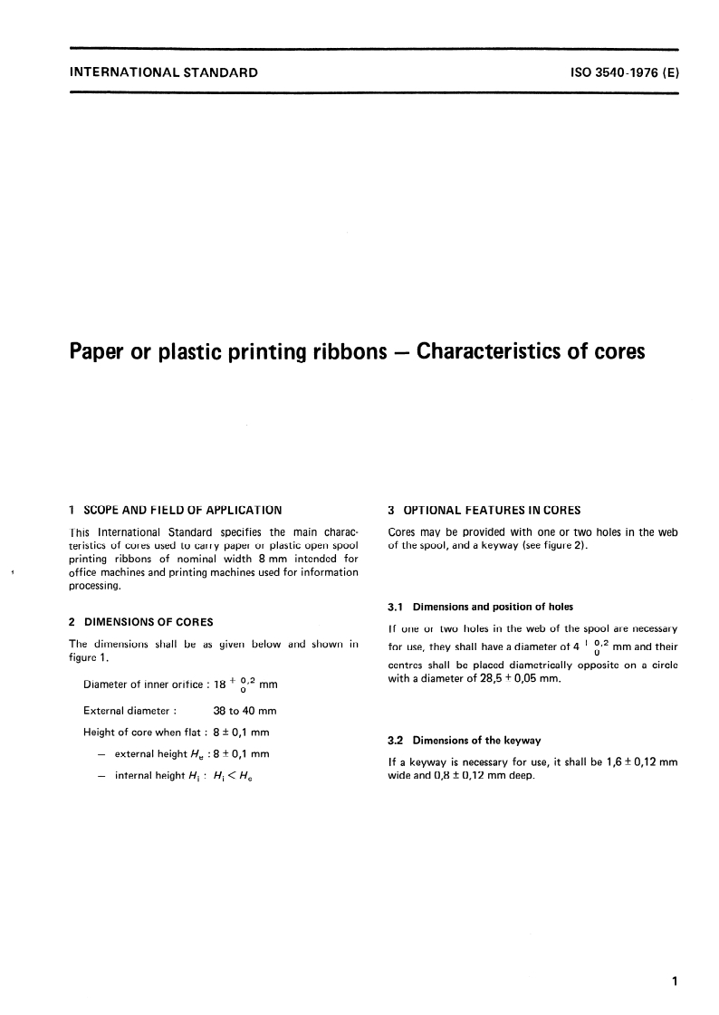 ISO 3540:1976 - Paper or plastic printing ribbons — Characteristics of cores/1/1976