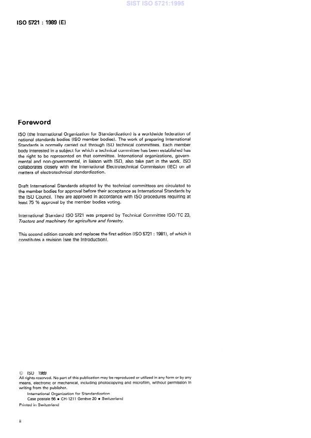 ISO 5721:1989 is a standard published by the International Organization for Standardization (ISO). Its full title is "Tractors for agriculture — Operator's field of vision". This standard covers: This second edition cancels and replaces the first edition (1981). Specifies practical and mathematical methods of determining the masking effects of obstruction on the angles of vision forward, to the rear and upwards of seated operators of tractors. It does not take account of detachable implements and mounted elements, for example front loaders, pallets, ect.
