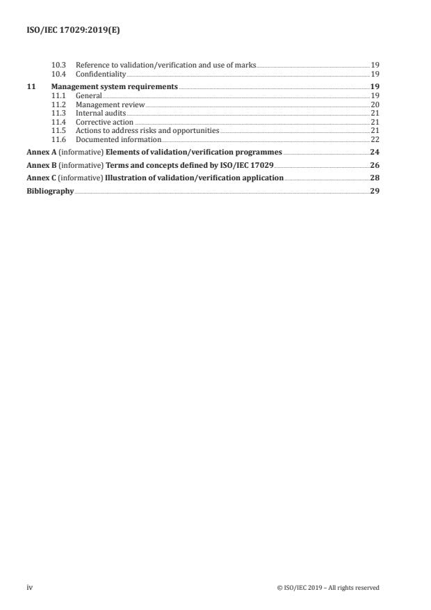 ISO/IEC 17029:2019 is a standard published by the International Organization for Standardization (ISO). Its full title is "Conformity assessment - General principles and requirements for validation and verification bodies". This standard covers: This document contains general principles and requirements for the competence, consistent operation and impartiality of bodies performing validation/verification as conformity assessment activities. Bodies operating according to this document can provide validation/verification as a first-party, second-party or third-party activity. Bodies can be validation bodies only, verification bodies only, or provide both activities. This document is applicable to validation/verification bodies in any sector, providing confirmation that claims are either plausible with regards to the intended future use (validation) or truthfully stated (verification). However, results of other conformity assessment activities (e.g. testing, inspection and certification) are not considered to be subject to validation/verification according to this document. Neither are situations where validation/verification activities are performed as steps within another conformity assessment process. This document is applicable to any sector, in conjunction with sector specific programmes that contain requirements for validation/verification processes and procedures. This document can be used as a basis for accreditation by accreditation bodies, peer assessment within peer assessment groups, or other forms of recognition of validation/verification bodies by international or regional organizations, governments, regulatory authorities, programme owners, industry bodies, companies, clients or consumers. NOTE This document contains generic requirements and is neutral with regard to the validation/verification programme in operation. Requirements of the applicable programmes are additional to the requirements of this document.